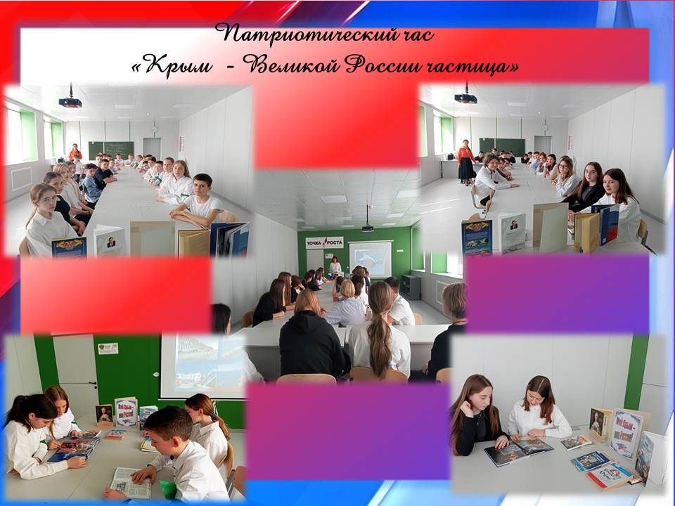 Ведущий библиотекарь рассказала об истории Крыма, которая неразрывно связана с Россией, учащиеся посмотрели хронологию событий 2014 года, которые привели к воссоединению Крыма с Россией. В ходе общения поговорили о наиболее значимых преобразованиях на территории полуострова за время его нахождения в составе Российской Федерации. Закончилось мероприятие Гимном Крымской весны, который написала Ольга Ковитиди Сенатор Совета Федерации Федерального собрания Российской Федерации от исполнительной власти Республики Крым.