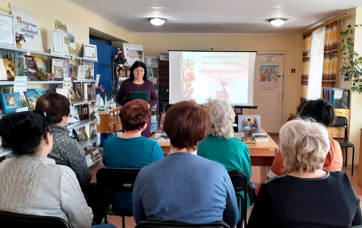 Сотрудники библиотеки-филиала №15 им. А. С. Грина в рамках проекта «Нет срока давности у нашей памяти», в рамках Года защитника Отечества, и празднования 80-летия Великой Победы, в канун празднования международного женского дня 8 Марта для членов любительского объединения «Акварель» провели вечер – посвящение «Мадонны войны», о женщинах защищавших нашу Родину в годы Великой Отечественной войны.